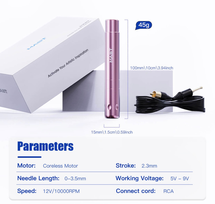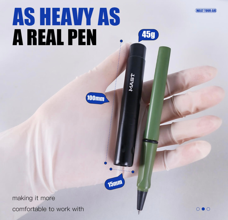سبک ترین دستگاه مست ، دستگاه تور ایر با وزن 45 گرمی است که مانند یک خودکار در دست به راحتی از آن استفاده میکنید و حمل میکنید. این دستگاه با استروک 2.3 بسیار مناسب کار آرایش دائم صورت و تتوهای مینیمال بدن است. بهترین ولتاژ براژ کار با این دستگاه 5 تا 9 ولت است.